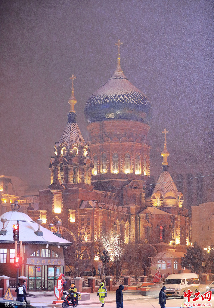 2019年11月12日,哈尔滨市,雪夜的索菲亚教堂,美如童话,吸引来全国各地的摄影人端着单反,立着三脚架,开着离机闪拍照。索菲亚教堂上空的雪花,缓缓飘落,让寒冷冬夜变得浪漫起来。图片作者:/视觉中国