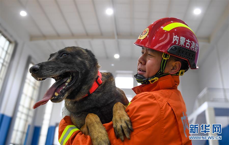 训导员在对搜救犬进行亲和训练(11月12日摄)。 包头市消防救援支队搜救犬中队是内蒙古目前唯一的一支搜救犬救援队,共有搜救犬32只,指战员15名,在今年举行的第五届全国消防救援队伍搜救犬技术比武中,他们取得了团体第三名的好成绩。搜救犬不仅能嗅出幸存者的气息,还能听到幸存者制造的响动,只要发现生命迹象就会大声吠叫作为提示,堪称救援中的“特种兵”。 新华社记者 彭源 摄