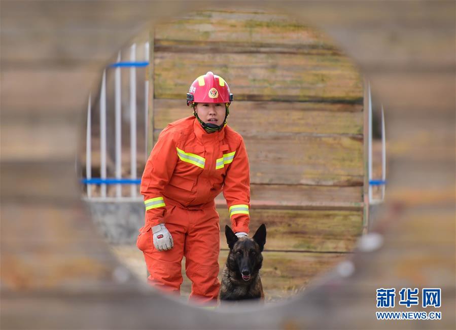 训导员指挥搜救犬进行翻越障碍训练(11月12日摄)。 包头市消防救援支队搜救犬中队是内蒙古目前唯一的一支搜救犬救援队,共有搜救犬32只,指战员15名,在今年举行的第五届全国消防救援队伍搜救犬技术比武中,他们取得了团体第三名的好成绩。搜救犬不仅能嗅出幸存者的气息,还能听到幸存者制造的响动,只要发现生命迹象就会大声吠叫作为提示,堪称救援中的“特种兵”。 新华社发(贝赫 摄)