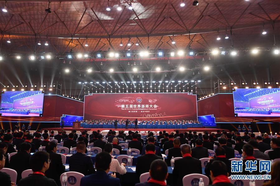 11月13日拍摄的第五届世界浙商大会开幕式现场。 当日,以“聚力高质量 共筑中国梦”为主题的第五届世界浙商大会在杭州国际博览中心开幕。本届大会包括2场主题活动、12项专题活动和15项联动活动。 新华社记者黄宗治摄