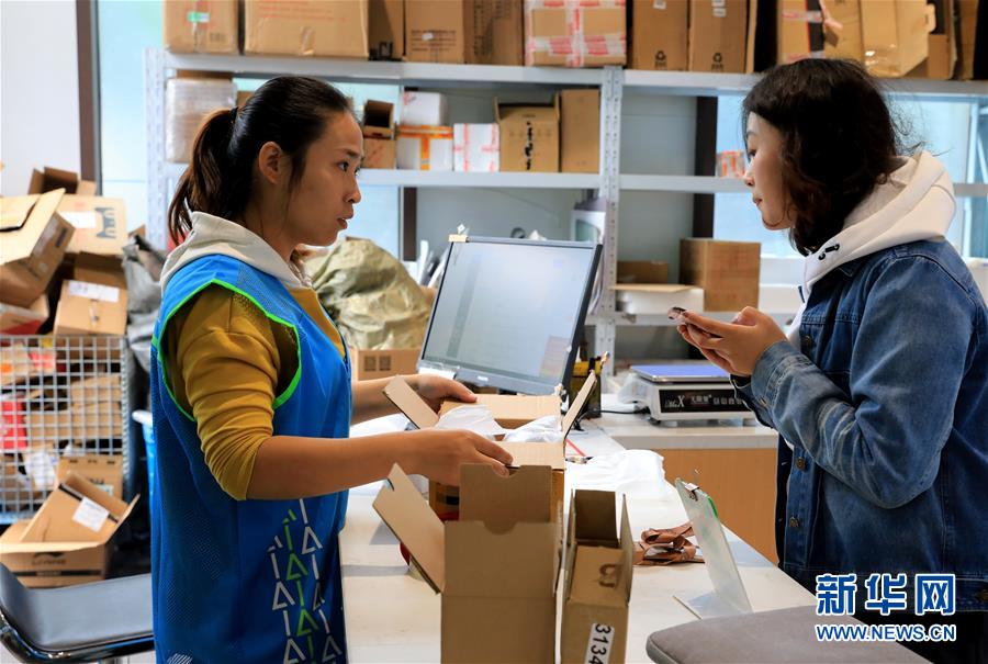 11月13日,驿站寄件员(左)使用回收纸盒帮顾客包装需要快递的物品。 当日,位于上海交通大学闵行校区内的菜鸟驿站快递收发点迎来了“双11”购物节后的首个快递到达高峰。为了提高快递包装的循环使用率,菜鸟驿站在校园里推行“回箱计划”,回收快递纸箱并进行再次共享使用,受到师生欢迎。 新华社记者方喆摄