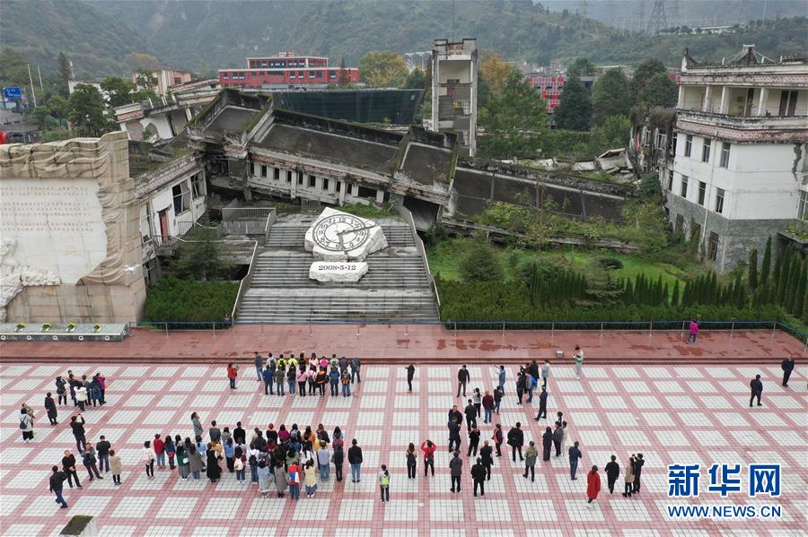 人们在四川省汶川县映秀镇四川汶川特大地震漩口中学遗址参观(11月12日无人机拍摄)。 汶川县映秀镇是2008年“5·12”汶川特大地震震中所在地,如今一座新城拔地而起,城镇路面干净,餐馆、茶馆、土特产店铺林立,基础设施配套齐全,旅游功能齐备,养殖业、种植业、旅游业等产业正在恢复发展。 新华社记者 王建华 摄