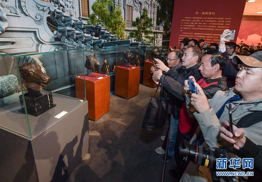 11月13日,观众在“回归之路——新中国成立70周年流失文物回归成果展”上参观圆明园马首铜像(左)。 新华社记者 李贺 摄