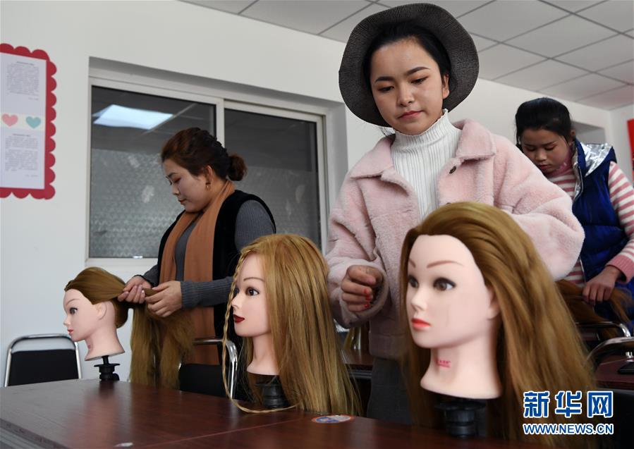 11月13日,在东乡县职业技术学校,美容美发培训班的学员在课堂上练习。 甘肃省临夏回族自治州东乡族自治县属于我国“三区三州”地区的深度贫困县。为帮助贫困劳动力拓宽就业渠道,东乡县职业技术学校为以建档立卡贫苦户为主的贫困劳动力进行免费技能培训,并免费提供食宿和多种生活必需品。培训内容涵盖美容美发、刺绣、拉面、电焊、驾驶技能等,今年以来累计培训各专业学员1100多人,为他们上岗就业和增收脱贫打下良好基础。 新华社记者 马宁 摄
