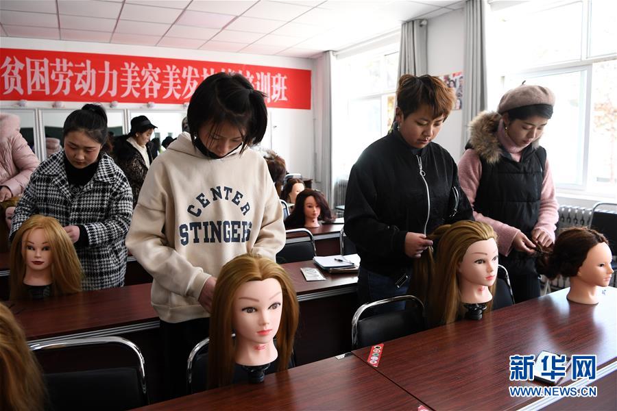 11月13日,在东乡县职业技术学校,美容美发培训班的学员在课堂上练习。 甘肃省临夏回族自治州东乡族自治县属于我国“三区三州”地区的深度贫困县。为帮助贫困劳动力拓宽就业渠道,东乡县职业技术学校为以建档立卡贫苦户为主的贫困劳动力进行免费技能培训,并免费提供食宿和多种生活必需品。培训内容涵盖美容美发、刺绣、拉面、电焊、驾驶技能等,今年以来累计培训各专业学员1100多人,为他们上岗就业和增收脱贫打下良好基础。 新华社记者 马宁 摄