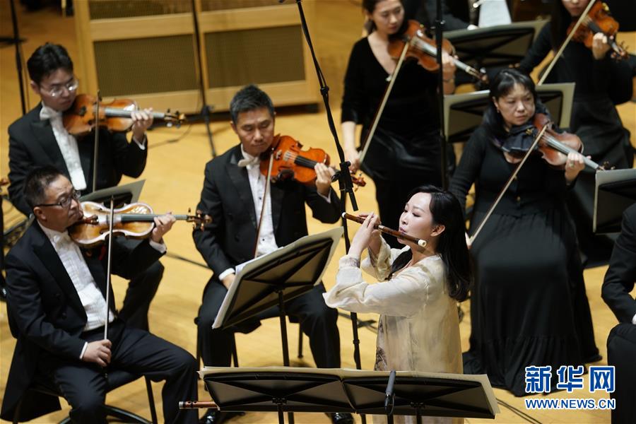 11月13日,竹笛演奏家范临风演奏《归去来兮·雪山之恋》。 当日,由指挥家谭利华执棒、中国交响乐团演出的《龙声华韵》——“盛世国韵”交响音乐会在北京音乐厅上演。 新华社记者 金良快 摄