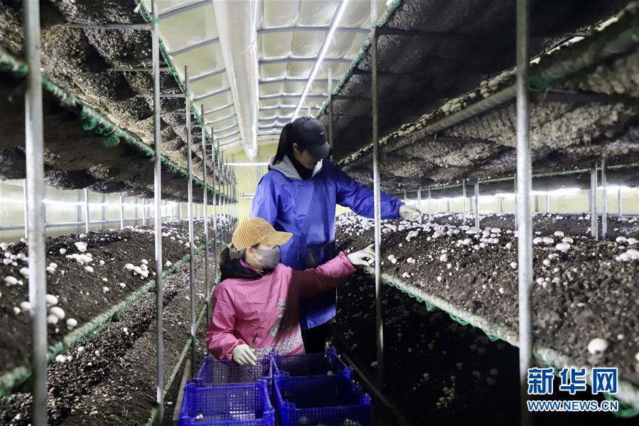11月13日,在黑龙江省明水县互助村双孢菇基地,两名员工采摘双孢菇。 黑龙江省明水县互助村于2018年引入双孢菇基地,主要从事双孢菇等食用菌育种、发酵、种植、加工与销售。智能化种植大棚可控制温度、湿度、二氧化碳浓度等指标,实现全年无间断生产。通过租金分红、设立公益岗位、土地流转等方式带动180余户贫困户脱贫,户均年增收2000元以上。 新华社发(徐凯鑫 摄)