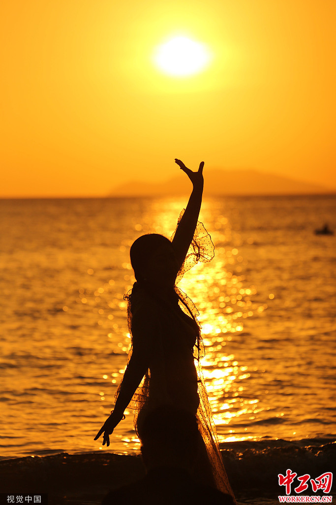 海南三亚:初冬夕阳美不胜收 游客海边享受生活