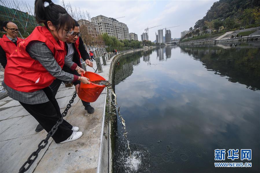 11月14日,杭州市临安区锦南街道党员志愿者在锦溪河投放鱼苗。 近年来,为提升河道水质,浙江省杭州市临安区锦南街道对辖区内主要河道落实了河长巡查责任制,并定期组织党员志愿者、工青妇群团志愿者开展护河行动。锦南街道通过河长制落实、黑臭水体整治、污水零直排建设、农村生活污水整治等一系列举措加大水环境治理力度,打造美丽河道,全面提升居民的幸福感。 新华社记者徐昱摄