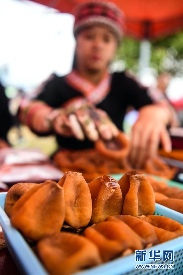 11月13日,广西平乐县桥亭乡大塘口村一位村民在摆放柿饼,供游客品尝。 目前,广西平乐县桥亭乡大塘口村种植的4000多亩月柿进入收获季,吸引众多游客前来品尝月柿美味,欣赏月柿林美景。大塘口村曾是一个人均收入不足800元的贫困小山村,通过大力发展月柿产业,如今已成为“广西农业旅游示范点”,月柿畅销国内外市场,全村年人均纯收入超过2万元。 新华社记者 张爱林 摄