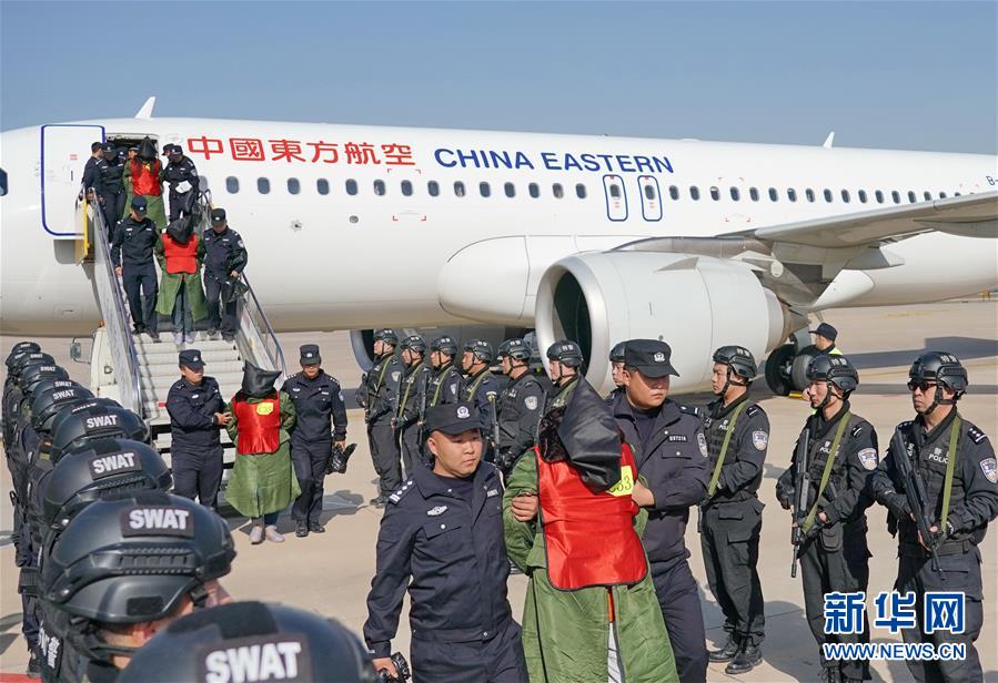 11月14日,在石家庄国际机场,犯罪嫌疑人被河北警方押解下飞机。 当日,河北警方将在菲律宾抓获的208名电信网络诈骗犯罪嫌疑人包机押解回国,至此,一大批跨境电信网络诈骗案成功告破。经初步核查,涉及案件达千余起,涉案金额上亿元。 新华社记者 杨世尧 摄