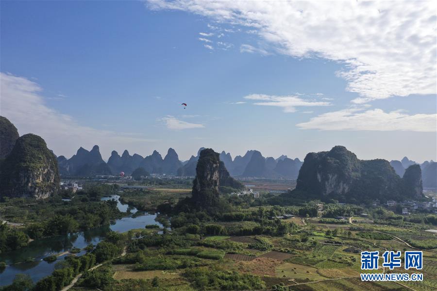 11月14日无人机拍摄的广西阳朔山水美景。 一场小雨后,广西桂林市阳朔县空气清新。在阳光的照耀下,山水与蓝天白云构成一幅美丽的山水画卷。 新华社记者曹祎铭摄