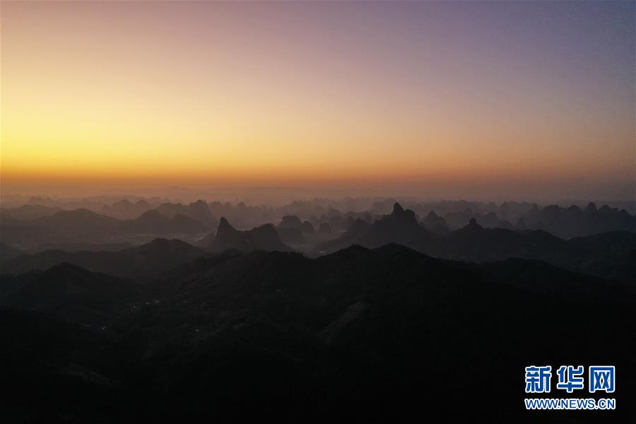 11月14日无人机拍摄的落日余晖中的广西阳朔。 一场小雨后,广西桂林市阳朔县空气清新。在阳光的照耀下,山水与蓝天白云构成一幅美丽的山水画卷。 新华社记者曹祎铭摄