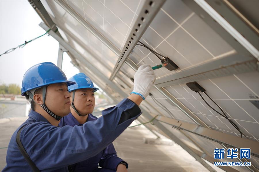 11月15日,河北省南和县供电公司员工在南和县圪塔头村检修屋顶光伏设备。新华社记者 牟宇 摄