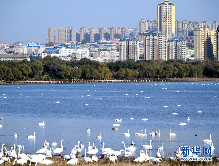 白天鹅在三门峡天鹅湖国家城市湿地公园内栖息(11月14日摄)。 初冬时节,大批白天鹅从西伯利亚南迁,来到河南省三门峡市黄河湿地栖息越冬。近年来,随着生态环境好转以及黄河水质的改善,来这里越冬的白天鹅数量逐年增多。 新华社发(郝源 摄)