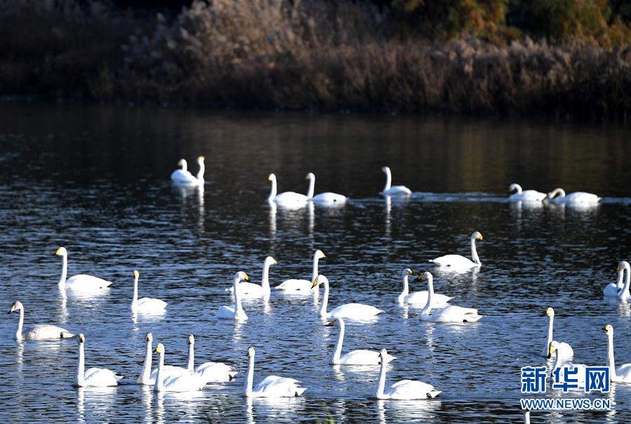 白天鹅在三门峡天鹅湖国家城市湿地公园内栖息(11月14日摄)。 初冬时节,大批白天鹅从西伯利亚南迁,来到河南省三门峡市黄河湿地栖息越冬。近年来,随着生态环境好转以及黄河水质的改善,来这里越冬的白天鹅数量逐年增多。 新华社发(郝源 摄)