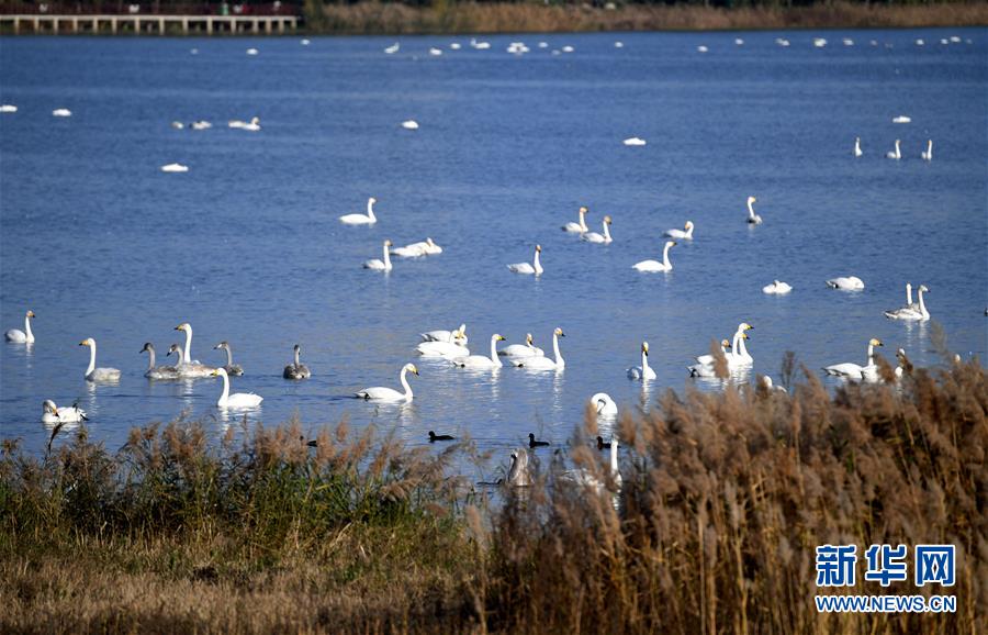 白天鹅在三门峡天鹅湖国家城市湿地公园内栖息(11月14日摄)。 初冬时节,大批白天鹅从西伯利亚南迁,来到河南省三门峡市黄河湿地栖息越冬。近年来,随着生态环境好转以及黄河水质的改善,来这里越冬的白天鹅数量逐年增多。 新华社发(郝源 摄)