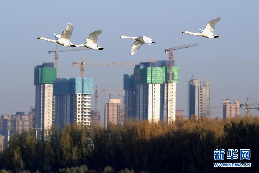 白天鹅在三门峡天鹅湖国家城市湿地公园上空飞翔(11月14日摄)。 初冬时节,大批白天鹅从西伯利亚南迁,来到河南省三门峡市黄河湿地栖息越冬。近年来,随着生态环境好转以及黄河水质的改善,来这里越冬的白天鹅数量逐年增多。 新华社记者 李安 摄