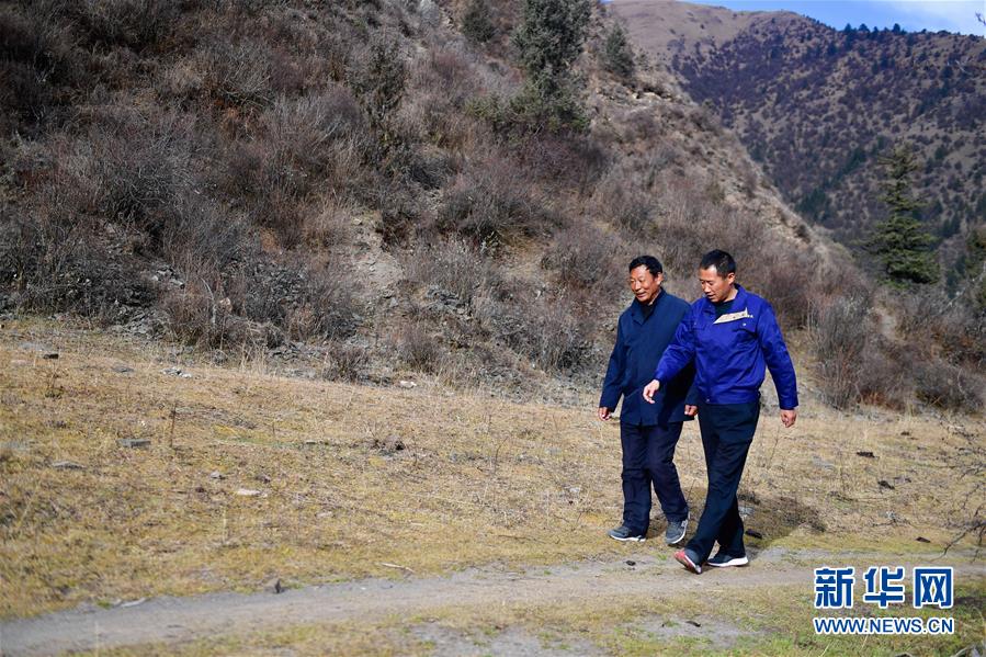 玛可河林场护林员安孜尕太(左)和朱福海在林区巡查(11月12日摄)。 新华社记者张龙摄
