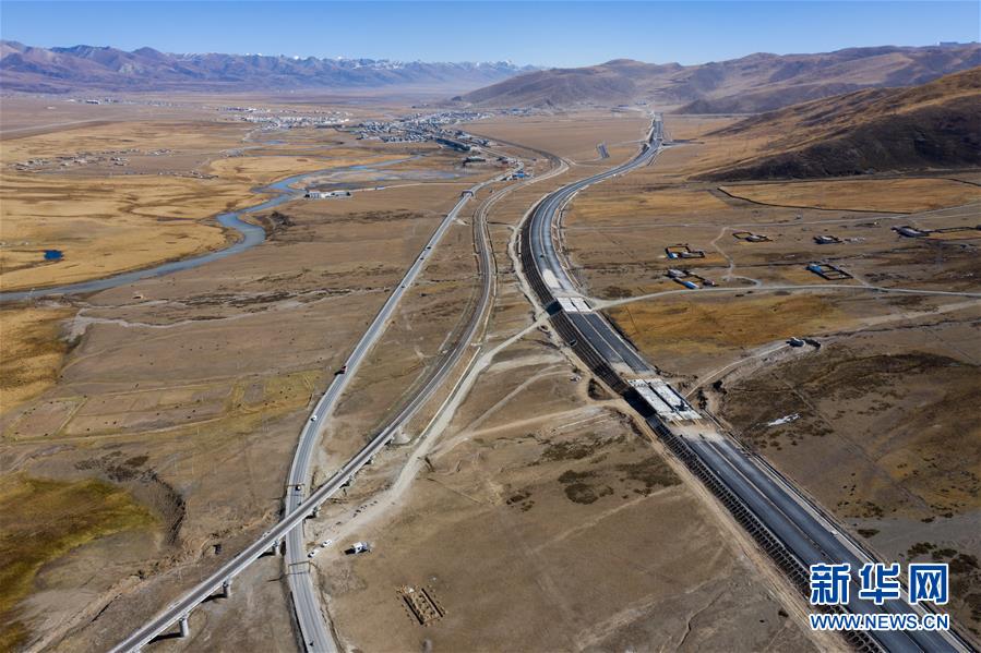 西藏当雄县城附近,青藏铁路、国道和即将完工的公路并行(10月28日摄)。 川藏公路又称川藏线,全长2000多公里,从成都到拉萨包括北线317国道主要路段、南线318国道部分路段。全线海拔落差大,沿途分布着众多冰川、草原、峡谷、河流、湖泊、温泉、森林、村寨等原生态自然景观和丰富多彩的人文景观,被誉为“中国最美景观大道”。 新华社记者 江宏景 摄