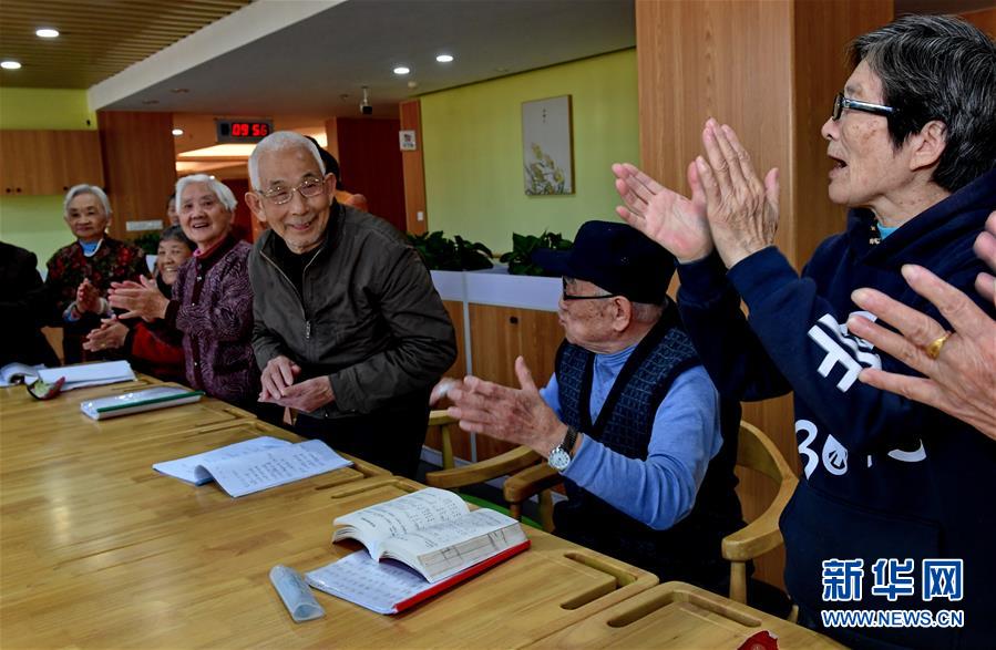 11月14日,在建瓯颐养中心,老人们欢迎新成员加入合唱队。 新华社记者张国俊摄