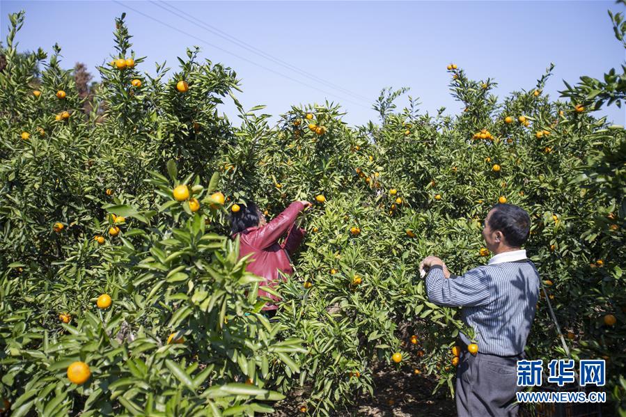 11月15日,在新干县神政桥乡桥头村柑橘基地,贫困户王笃青夫妇在采摘柑橘。 近年来,为助力脱贫攻坚,江西省吉安市新干县因地制宜,发展特色农业。通过政府扶持、企业投入、贫困户入股的形式,建设罗汉果、柑橘、油茶等特色产业基地,有效拓宽贫困户增收渠道,带动贫困户增收脱贫。 新华社记者 张浩波 摄