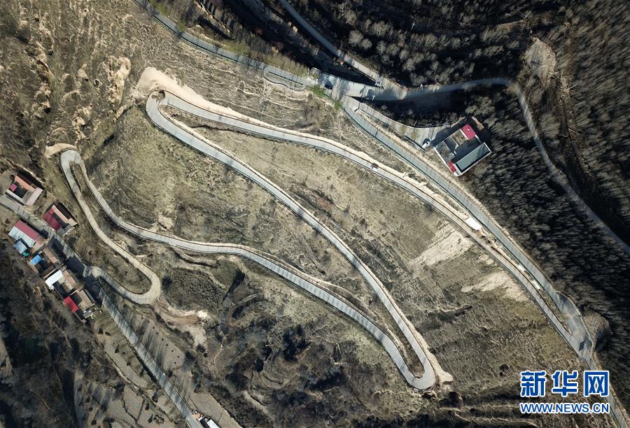 11月15日,车辆行驶在广河县水泉乡康坪村的乡村公路上(无人机拍摄)。新华社记者 马宁 摄