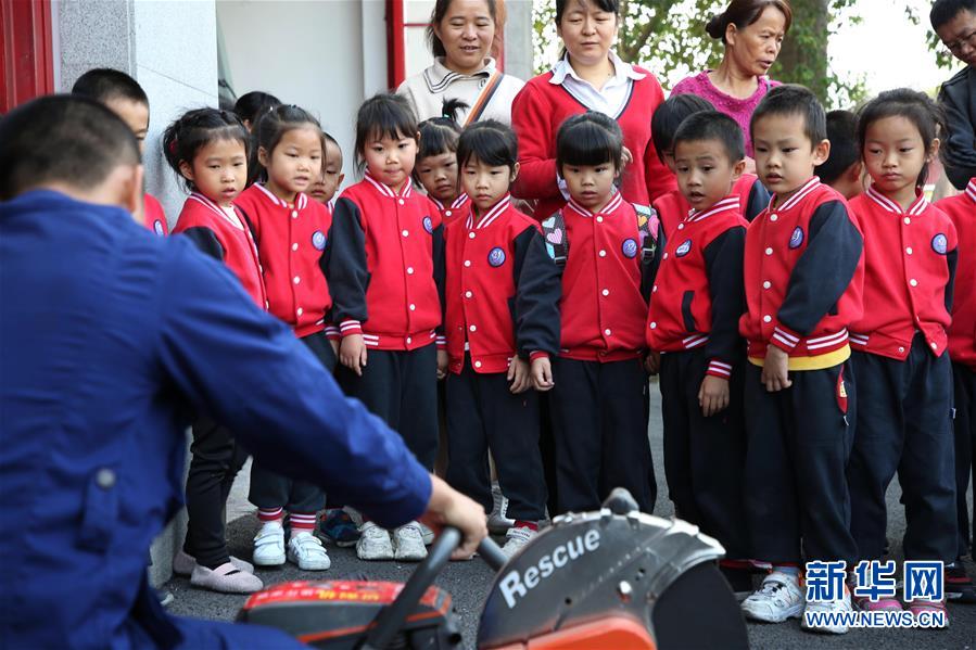 11月15日,消防队员为幼儿师生讲解消防器材知识。 新华社发(周杨东摄)