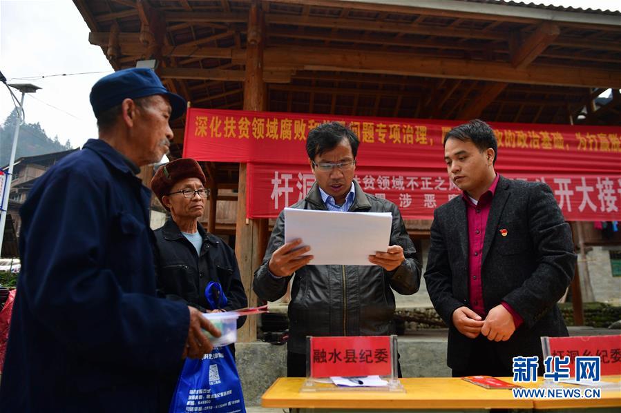 11月16日,在广西融水苗族自治县杆洞乡乌英苗寨,纪检监察干部(右一、右二)在了解扶贫产业补助资金的落实情况。新华社记者 黄孝邦 摄