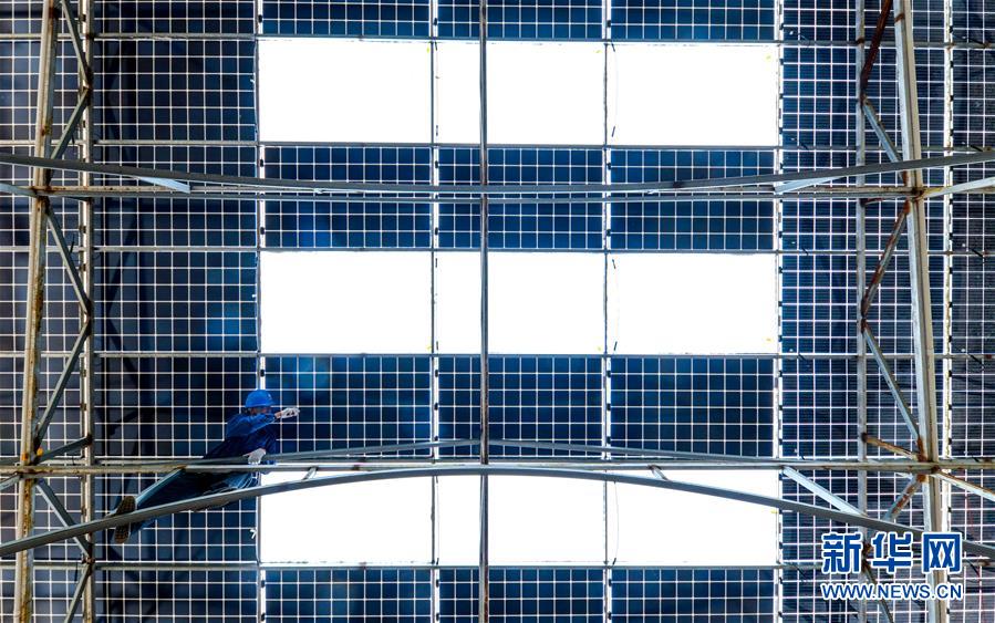 11月16日,在肥乡区元固乡东河头堡村,邯郸市肥乡区供电公司员工在检修屋顶光伏设备。新华社记者 王晓 摄