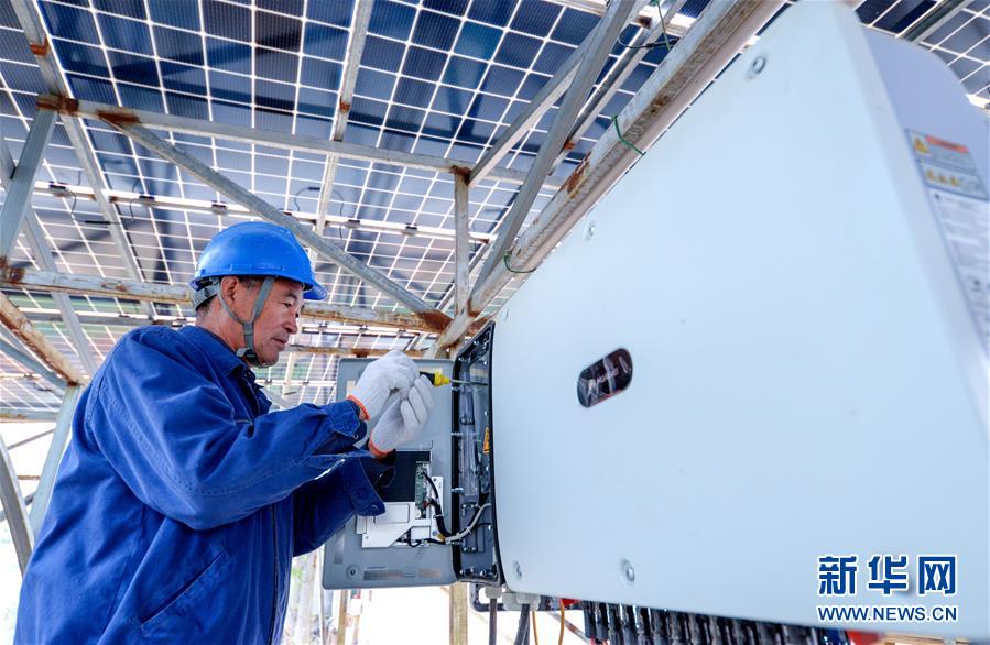 11月16日,在肥乡区元固乡东河头堡村,邯郸市肥乡区供电公司员工在检修屋顶光伏设备。新华社记者 王晓 摄