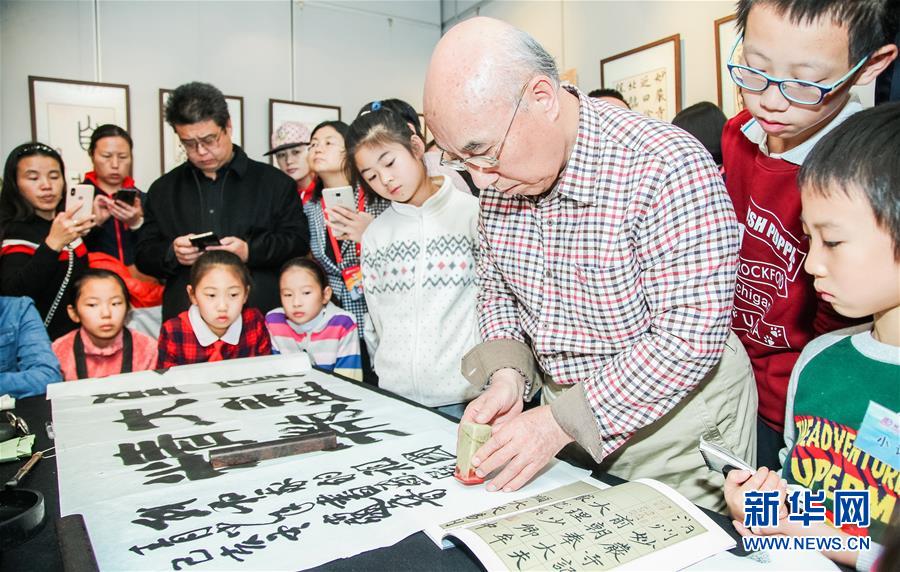 11月16日,书法家为东城区少年宫的老师和学生展示书法创作。新华社记者 李欣 摄