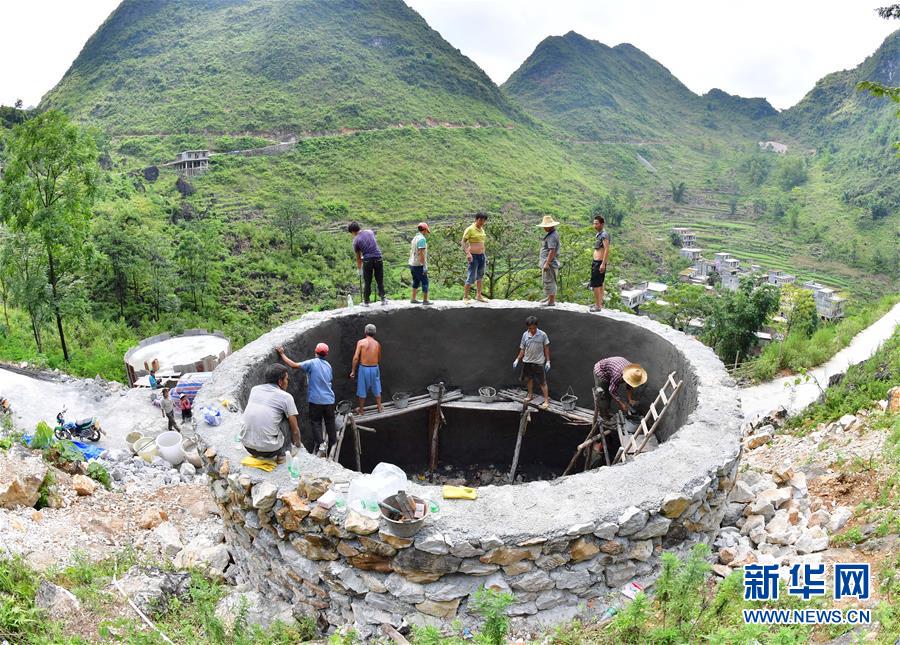 在广西大化瑶族自治县板升乡弄勇村,群众在修建家庭水柜(2017年9月2日摄)。新华社记者 黄孝邦 摄