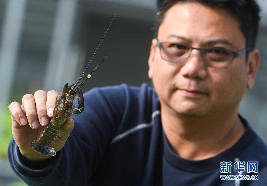 11月17日,在位于湖州市东林镇的湖州吴兴青芜家庭农场鱼菜共生大棚里,工作人员展示从鱼菜共生池内捕捞的澳洲龙虾。 新华社记者 徐昱 摄