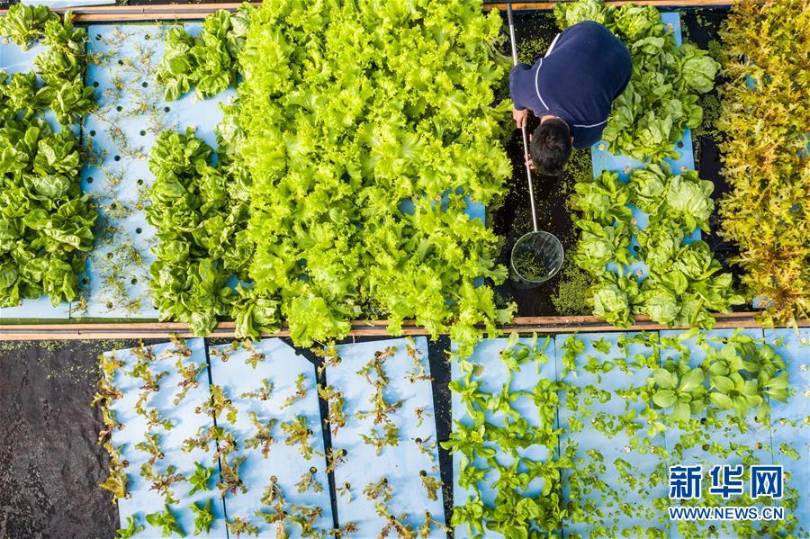 11月17日,在位于湖州市东林镇的湖州吴兴青芜家庭农场鱼菜共生大棚里,工作人员从鱼菜共生池内捕捞澳洲龙虾(无人机拍摄)。 新华社记者 徐昱 摄