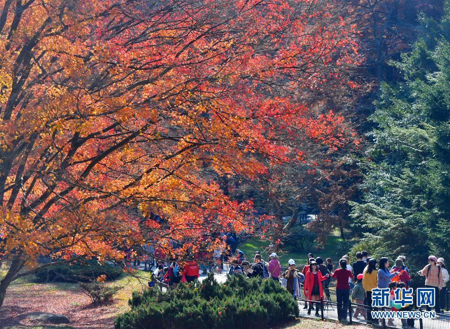 11月17日,游客在庐山植物园内游玩。 初冬时节,江西庐山风景区层林尽染,火红的枫叶吸引众多游客前来参观,令人流连忘返。 新华社记者 胡晨欢 摄