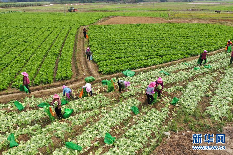 村民在鹿寨县平山镇石龙村禾道屯采收大肉芥菜(11月7日无人机拍摄)。新华社记者 周华 摄
