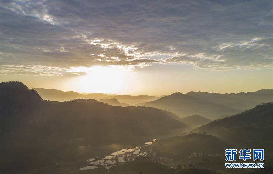 这是武夷山日出后的田园风光(11月17日无人机拍摄)。 初冬时节,福建省武夷山绿意依旧,茶园、山峦、村落在朝霞的映衬下美不胜收,呈现出一派怡然秀丽的山水田园风光。 新华社记者 宋为伟 摄