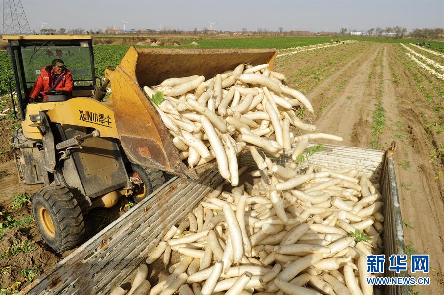 11月17日,黄骅市常郭镇李子札村农民将收获的白萝卜装车。时下,河北省黄骅市常郭镇近万亩白萝卜进入收获期,田间地头一派丰收景象。近年来,常郭镇积极引导农民调整农业产业结构,采取“公司+合作社+农户”的经营模式,鼓励农民因地制宜发展白萝卜种植,将白萝卜产业发展成农民致富、出口创汇的特色产业,产品远销日本、韩国、新加坡等国外市场。新华社记者 牟宇 摄