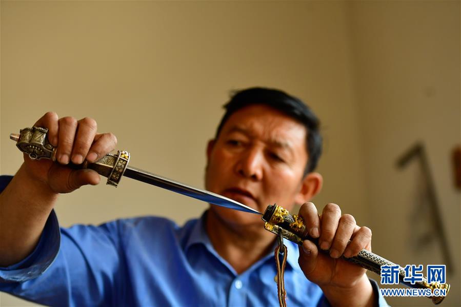 11月17日,芒擦藏刀匠人更求彭措在查看藏刀刀锋。新华社记者 张龙 摄