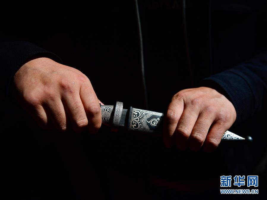 11月17日,芒擦藏刀匠人更求彭措在试藏刀刀身与刀鞘的契合度。新华社记者 张龙 摄