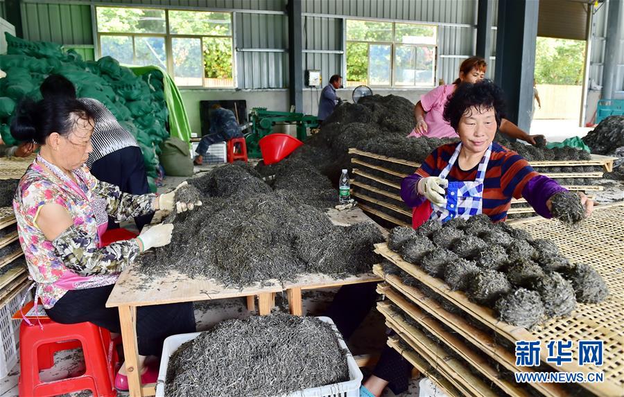 8月22日,在福安市溪邳村的海产品加工厂,村民对海带进行粗加工。新华社记者 林善传 摄