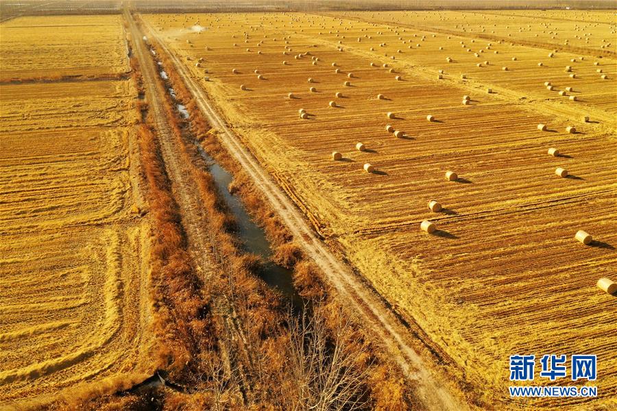 11月18日,工人驾驶机械在曹妃甸区收获稻草(无人机拍摄)。 河北省唐山市曹妃甸区地处渤海湾畔。初冬时节,工人忙着收获稻草,用于加工动物饲料。 新华社记者 邢广利 摄