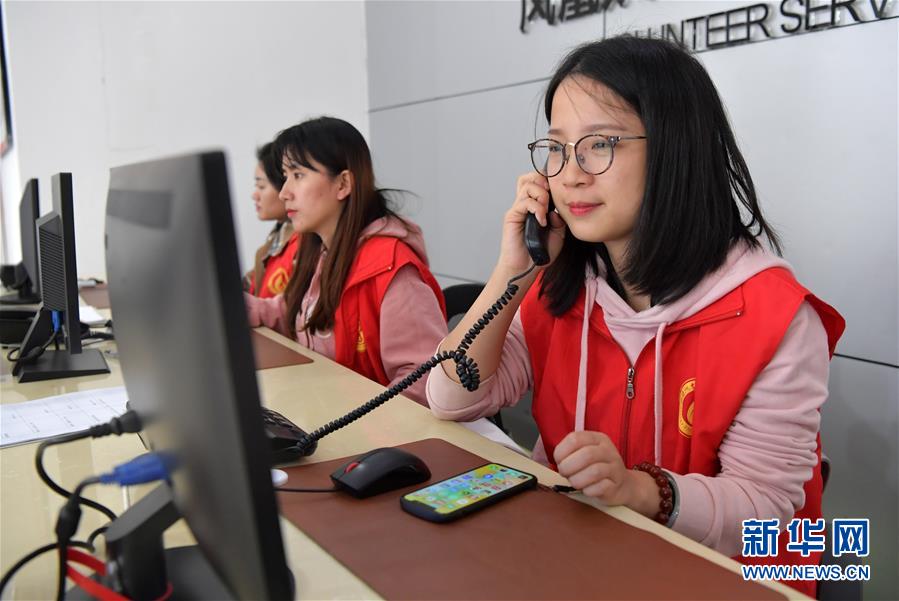 11月18日,志愿者在红谷滩新区凤凰洲志愿服务集散中心接听居民打来的电话。