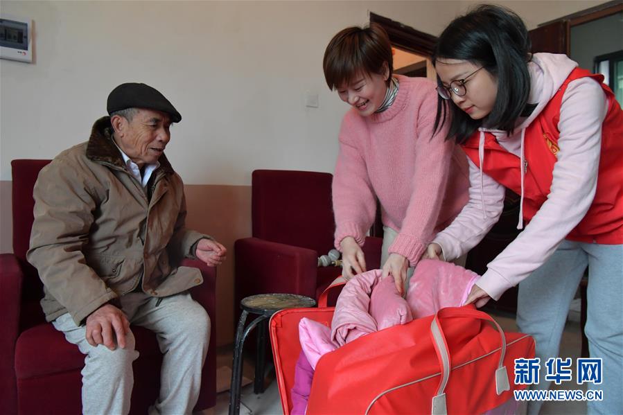 11月18日,在红谷滩新区凤凰花园社区,志愿者为一位生活困难的老人送来棉被和御寒衣物。