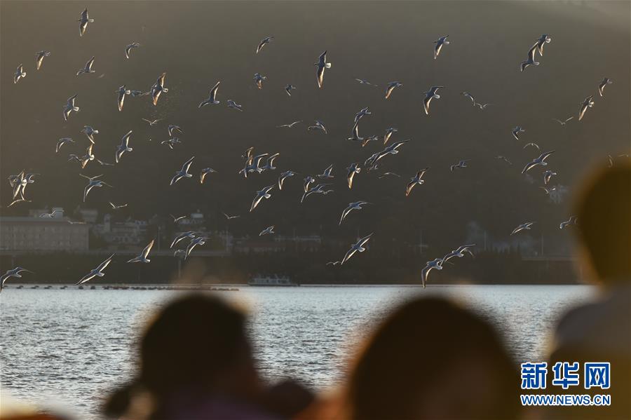 11月16日,游客在滇池观赏红嘴鸥。 每年冬季,数万只红嘴鸥飞临昆明越冬。据介绍,近年来飞临昆明越冬的红嘴鸥数量逐年增加,成为“春城”昆明的一道独特景观。 新华社记者 李芒茫 摄