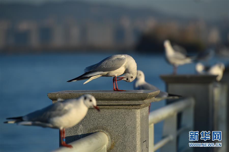 11月17日,红嘴鸥在滇池栖息。 每年冬季,数万只红嘴鸥飞临昆明越冬。据介绍,近年来飞临昆明越冬的红嘴鸥数量逐年增加,成为“春城”昆明的一道独特景观。 新华社记者 李芒茫 摄