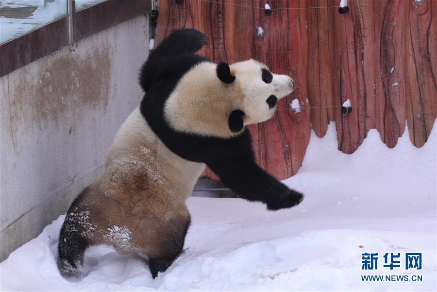 11月18日,大熊猫“牧云”在室外玩耍。 当日,一场大雪过后的长春市气温骤降,吉林省东北虎园熊猫馆大熊猫“牧云”却不惧寒冷,在冰天雪地里玩得不亦乐乎。 新华社记者 林宏 摄