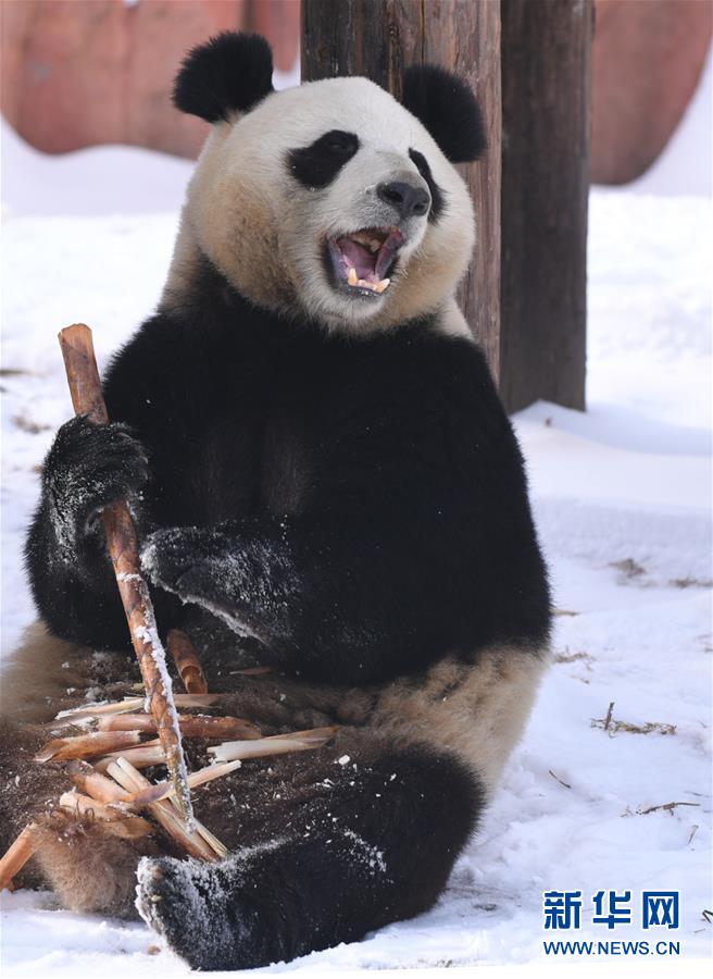 11月18日,大熊猫“牧云”在室外进食。 当日,一场大雪过后的长春市气温骤降,吉林省东北虎园熊猫馆大熊猫“牧云”却不惧寒冷,在冰天雪地里玩得不亦乐乎。 新华社记者 林宏 摄