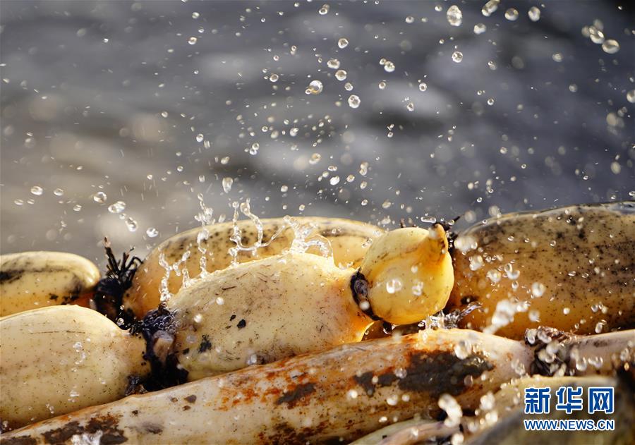 11月18日拍摄的莲藕。 初冬时节,河北省唐山市曹妃甸莲藕丰收,工人们在结冰之前忙着采收莲藕。 新华社记者 邢广利 摄